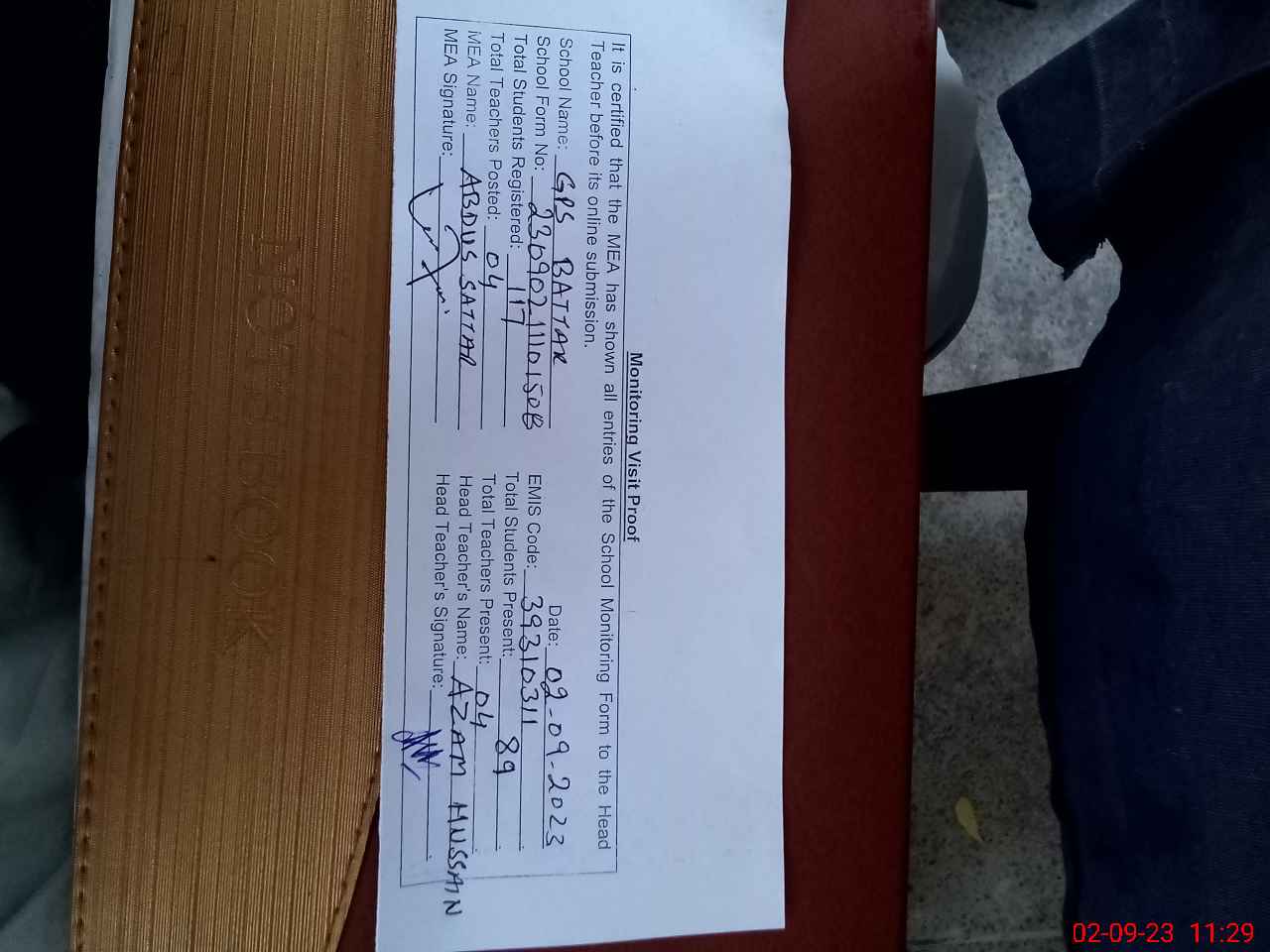 | Attendance Register | Head Teacher | MEA with School | Visit Proof |