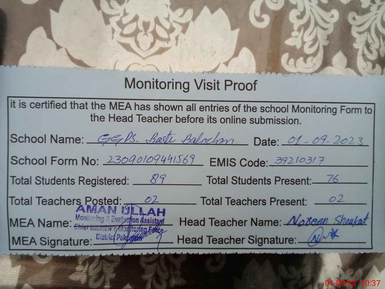 | Attendance Register | Head Teacher | MEA with School | Visit Proof |
