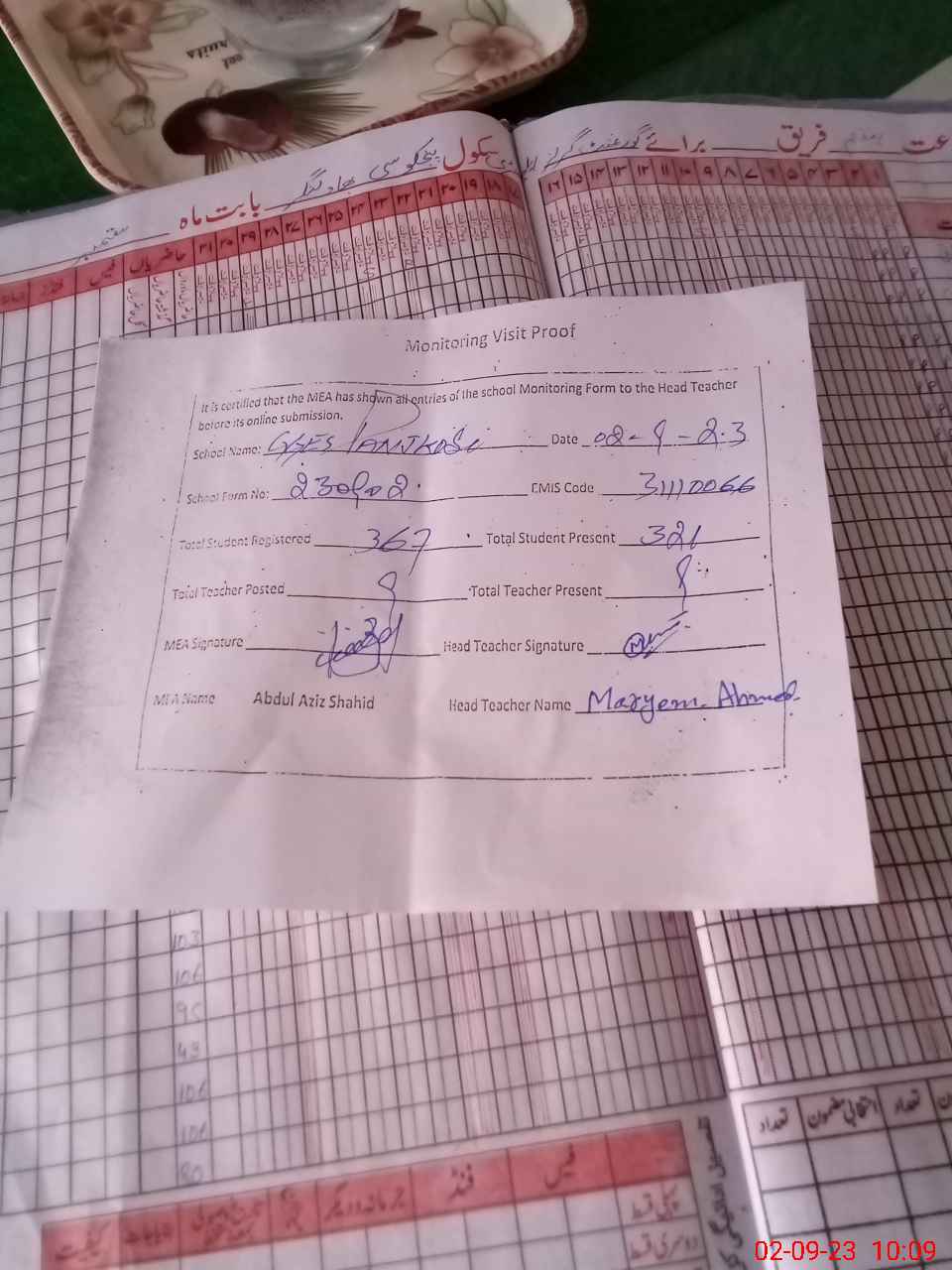 | Attendance Register | Head Teacher | MEA with School | Visit Proof |