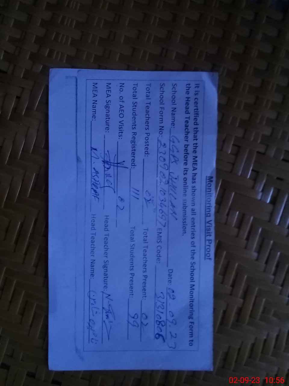 | Attendance Register | Head Teacher | MEA with School | Visit Proof |