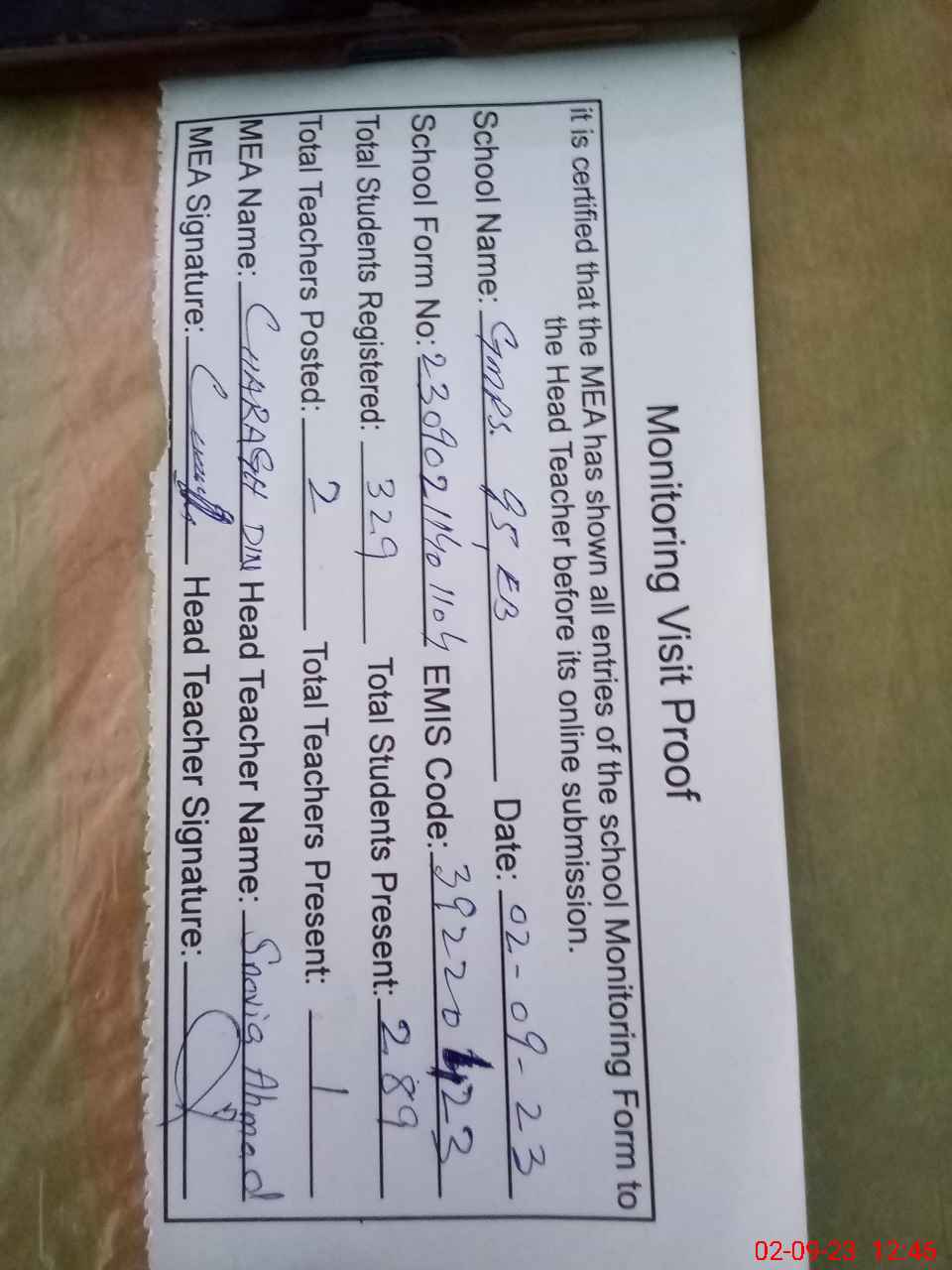 | Attendance Register | Head Teacher | MEA with School | Visit Proof |