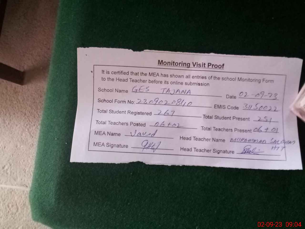 | Attendance Register | Head Teacher | MEA with School | Visit Proof |