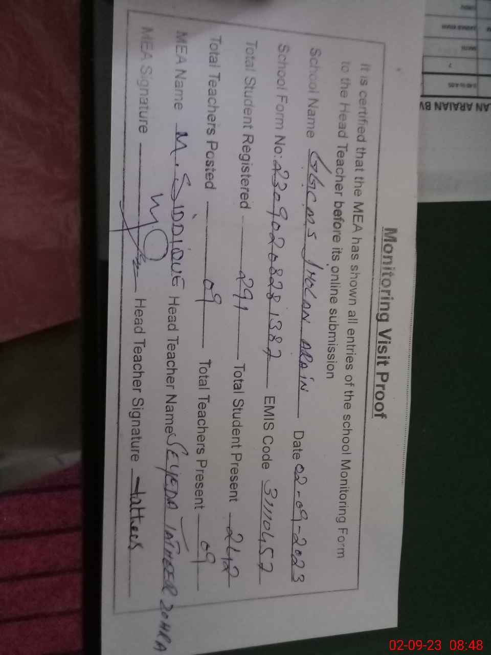 | Certified that this School was Inspected by the Undersigned MEA/DMO Today and the Information Stated Above is as Per Record. | |||||