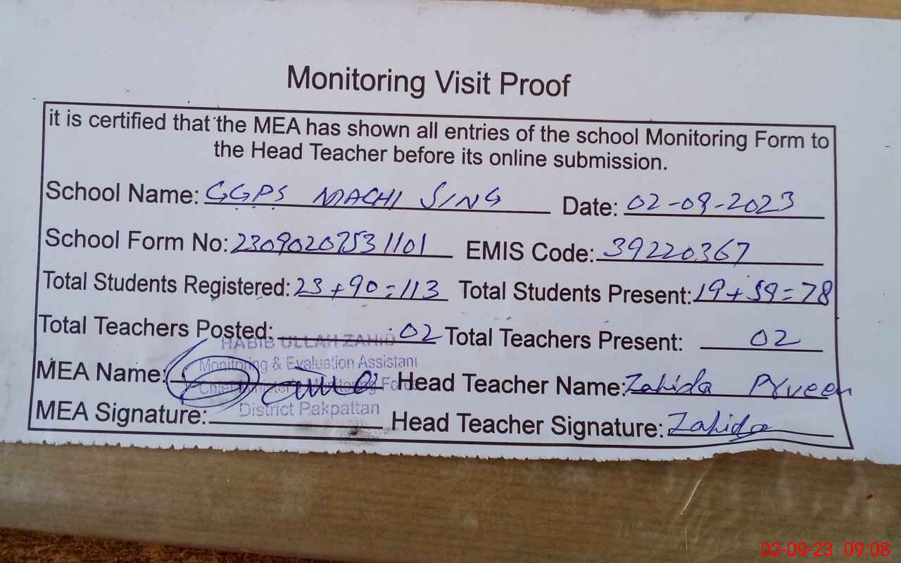 | Attendance Register | Head Teacher | MEA with School | Visit Proof |