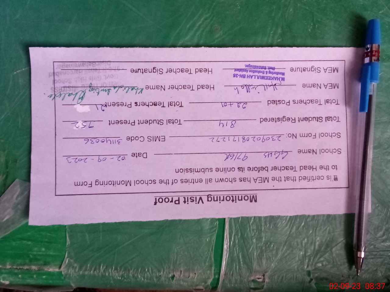 | Attendance Register | Head Teacher | MEA with School | Visit Proof |