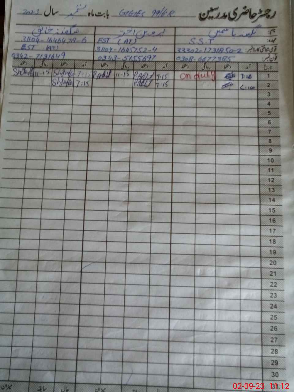 | CNIC | Full Name | Designation | R/C | Absence During Last Calender Month |