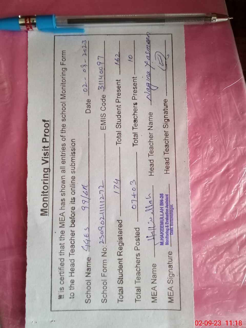 | Attendance Register | Head Teacher | MEA with School | Visit Proof |
