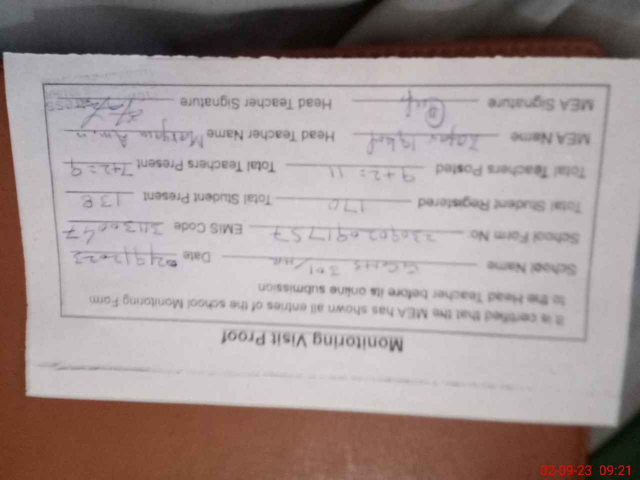 | Attendance Register | Head Teacher | MEA with School | Visit Proof |