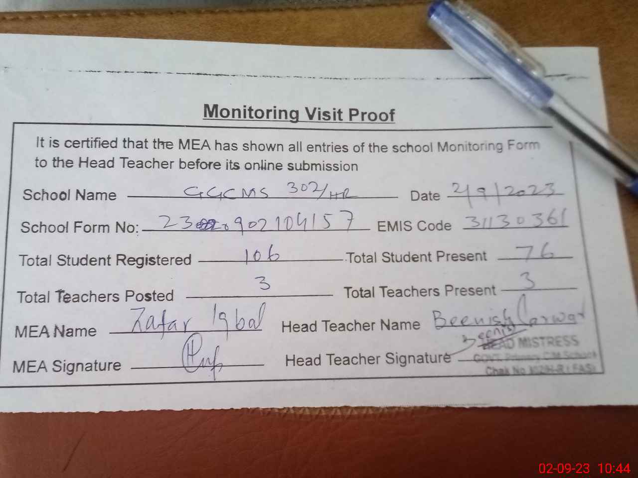 | Monitoring Date: 02-09-2023 | Start Time: 02-09-2023 10:26 AM | End Time: 02-09-2023 10:44 AM | Name of MEA: Za**** Iq**** BN**** | |