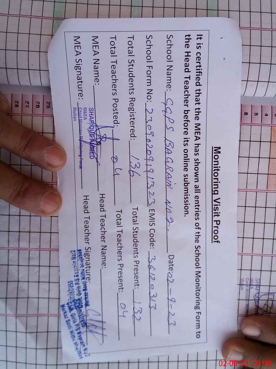 | Attendance Register | Head Teacher | MEA with School | Visit Proof |