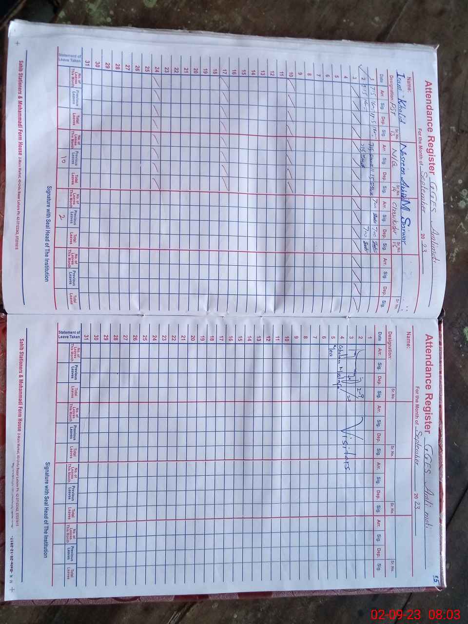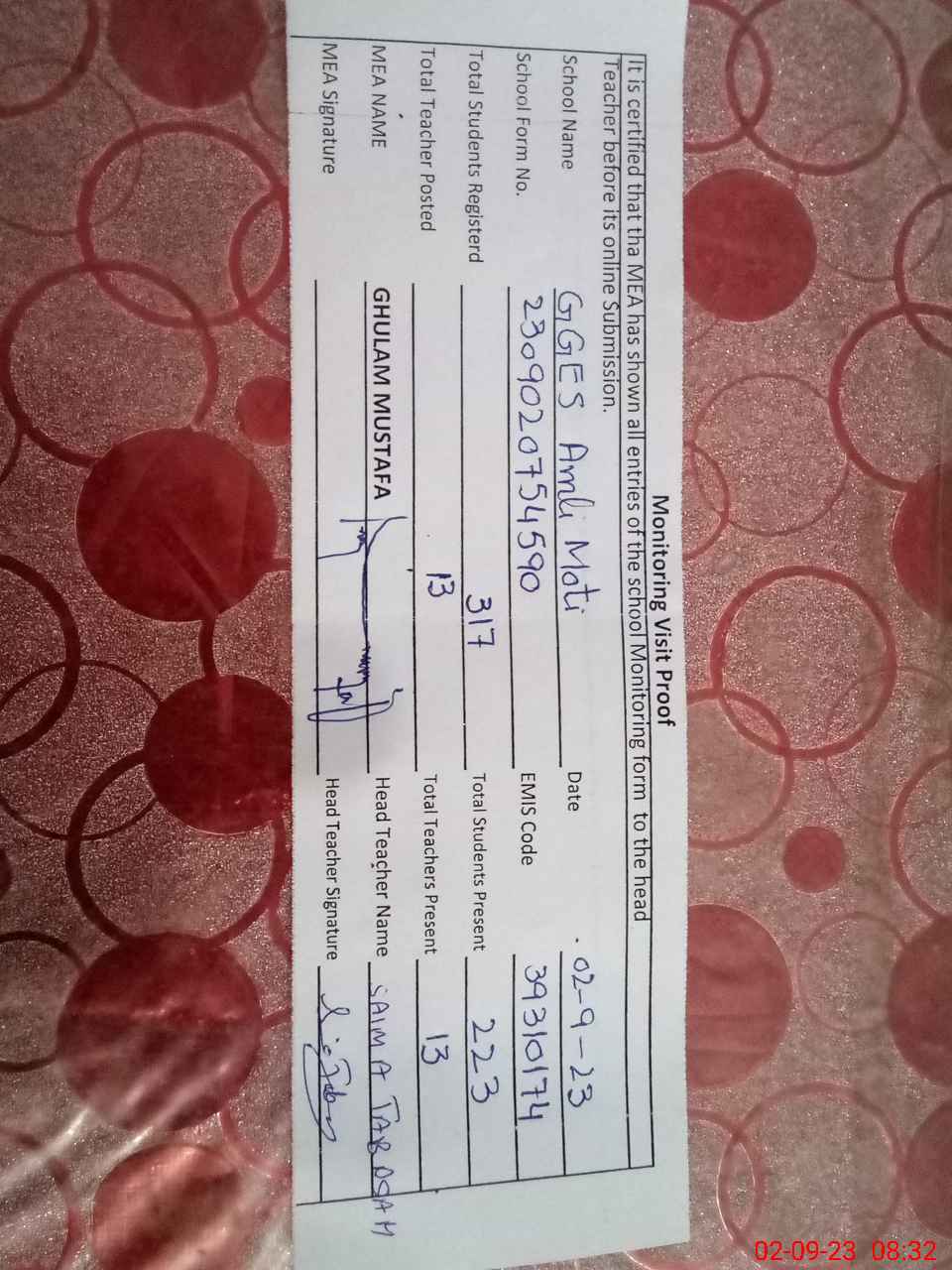 | Attendance Register | Head Teacher | MEA with School | Visit Proof |