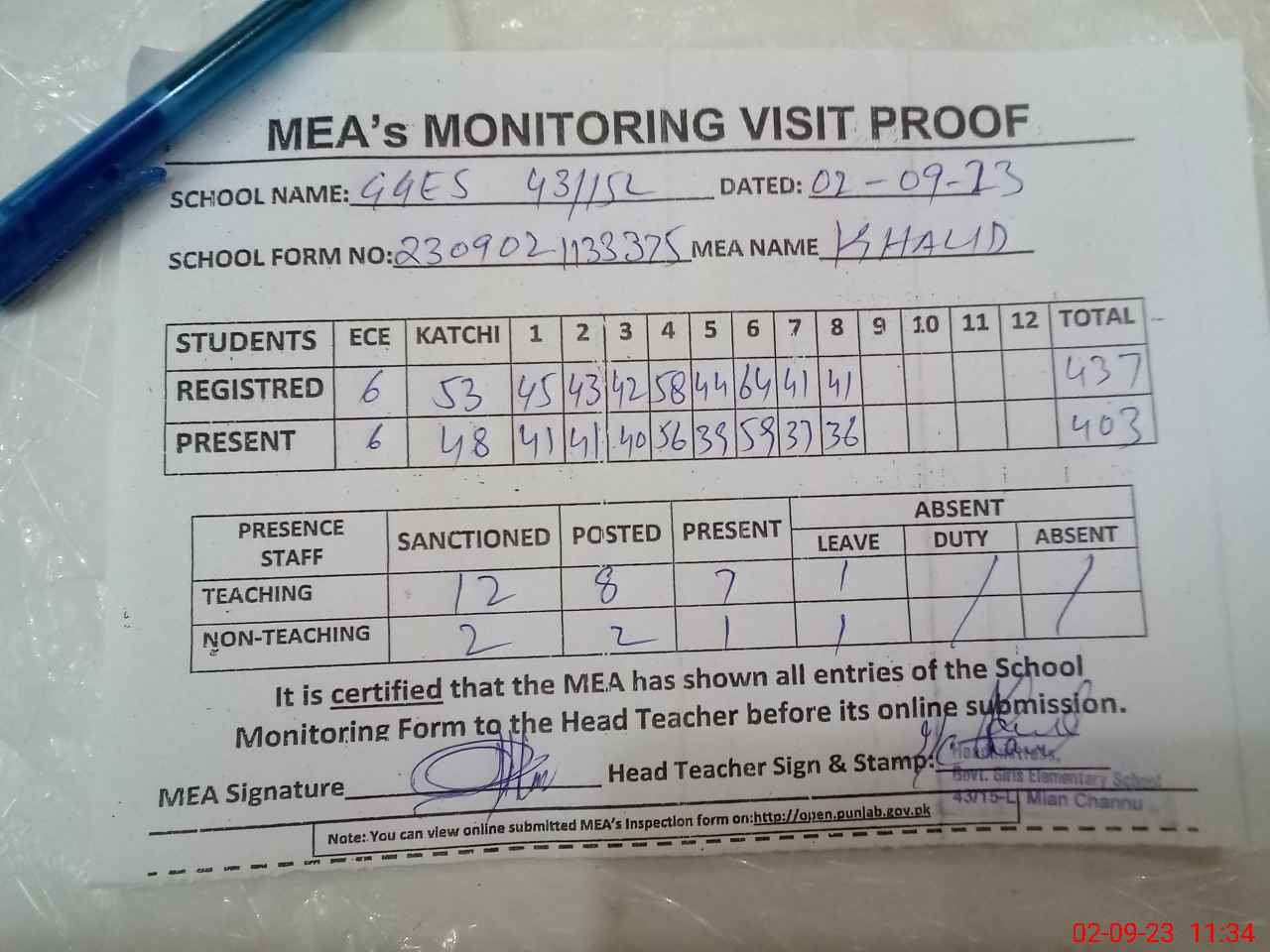 | EMIS Code: 36430338 | Name of School: GGES 43/15-L, MIAN CHANNU | |||