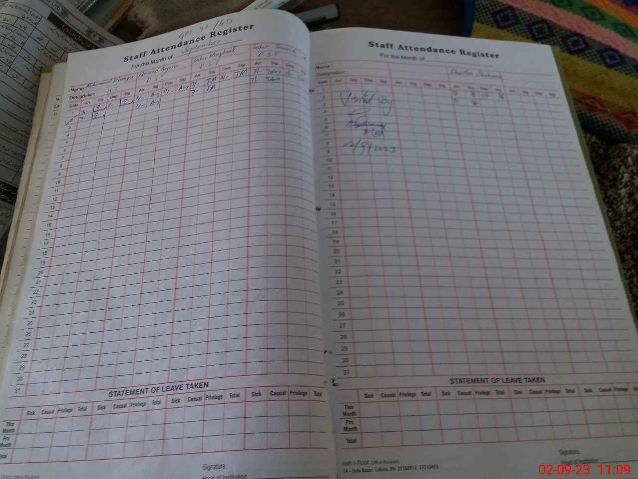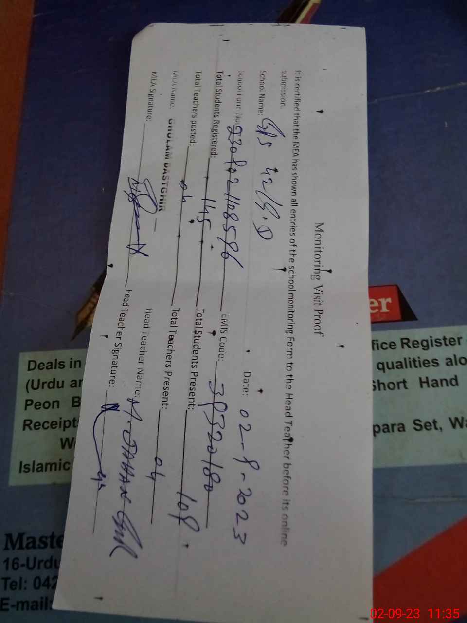 | Attendance Register | Head Teacher | MEA with School | Visit Proof |