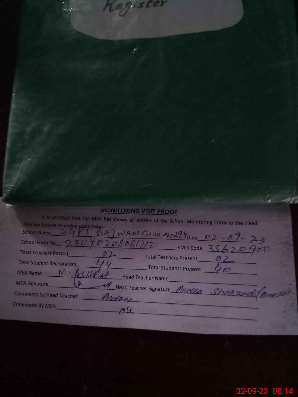 | Attendance Register | Head Teacher | MEA with School | Visit Proof |