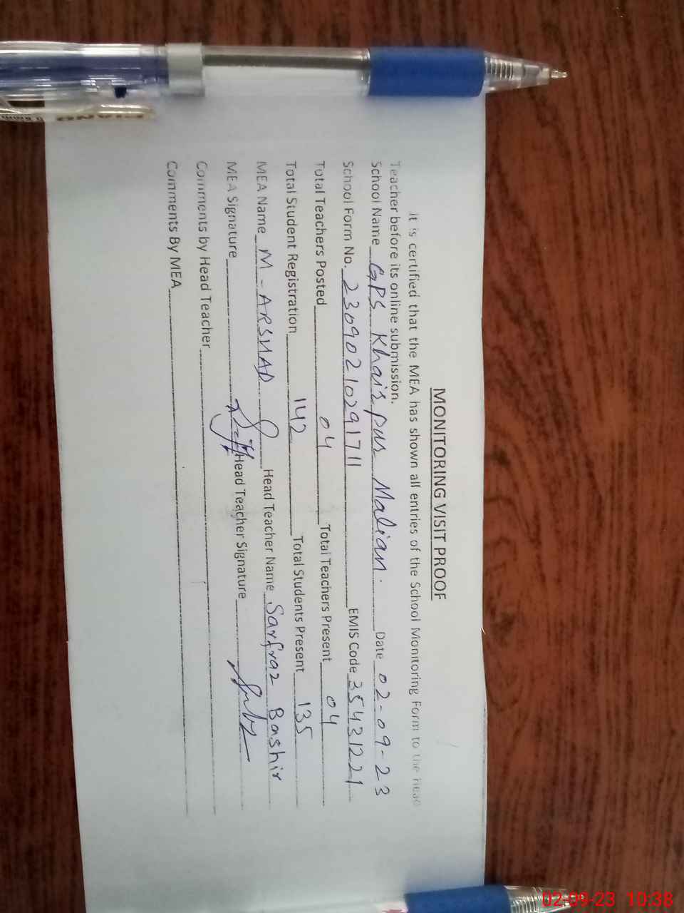 | Attendance Register | Head Teacher | MEA with School | Visit Proof |