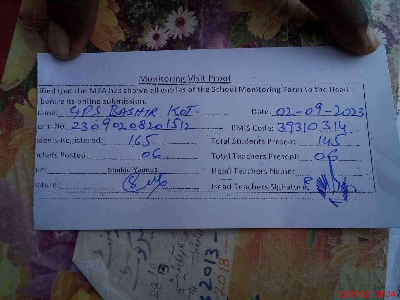 | Attendance Register | Head Teacher | MEA with School | Visit Proof |