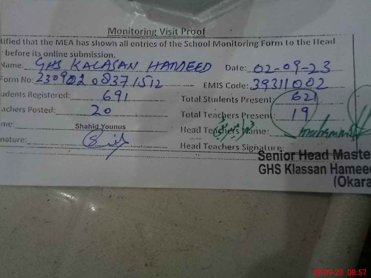 | Attendance Register | Head Teacher | MEA with School | Visit Proof |
