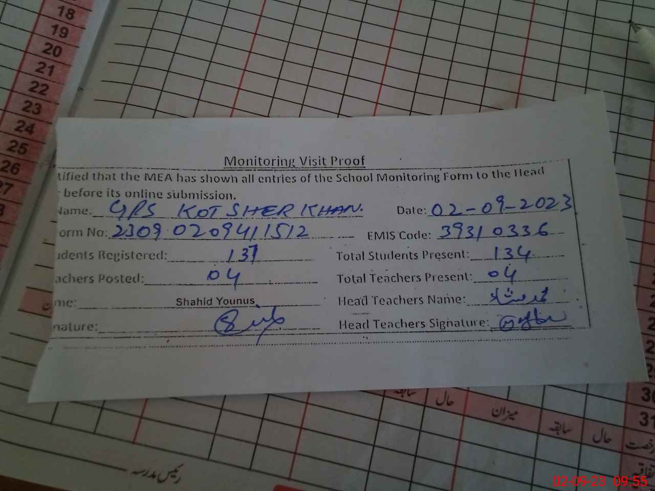 | Attendance Register | Head Teacher | MEA with School | Visit Proof |