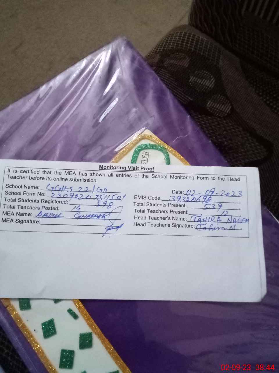 | EMIS Code: 39320698 | Name of School: GGHS 22/G.D | |||