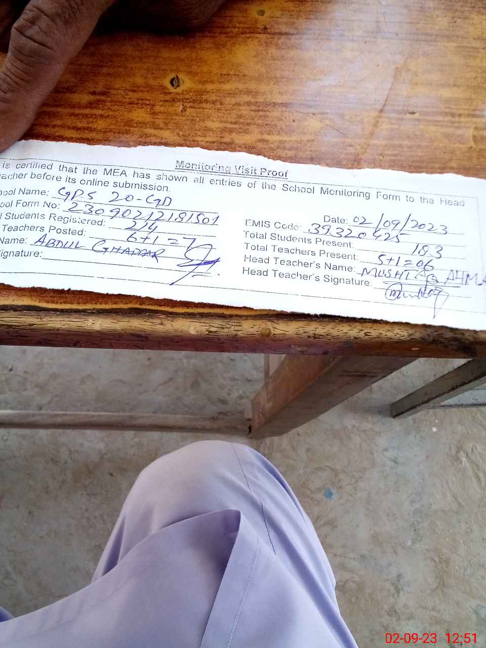 | Attendance Register | Head Teacher | MEA with School | Visit Proof |