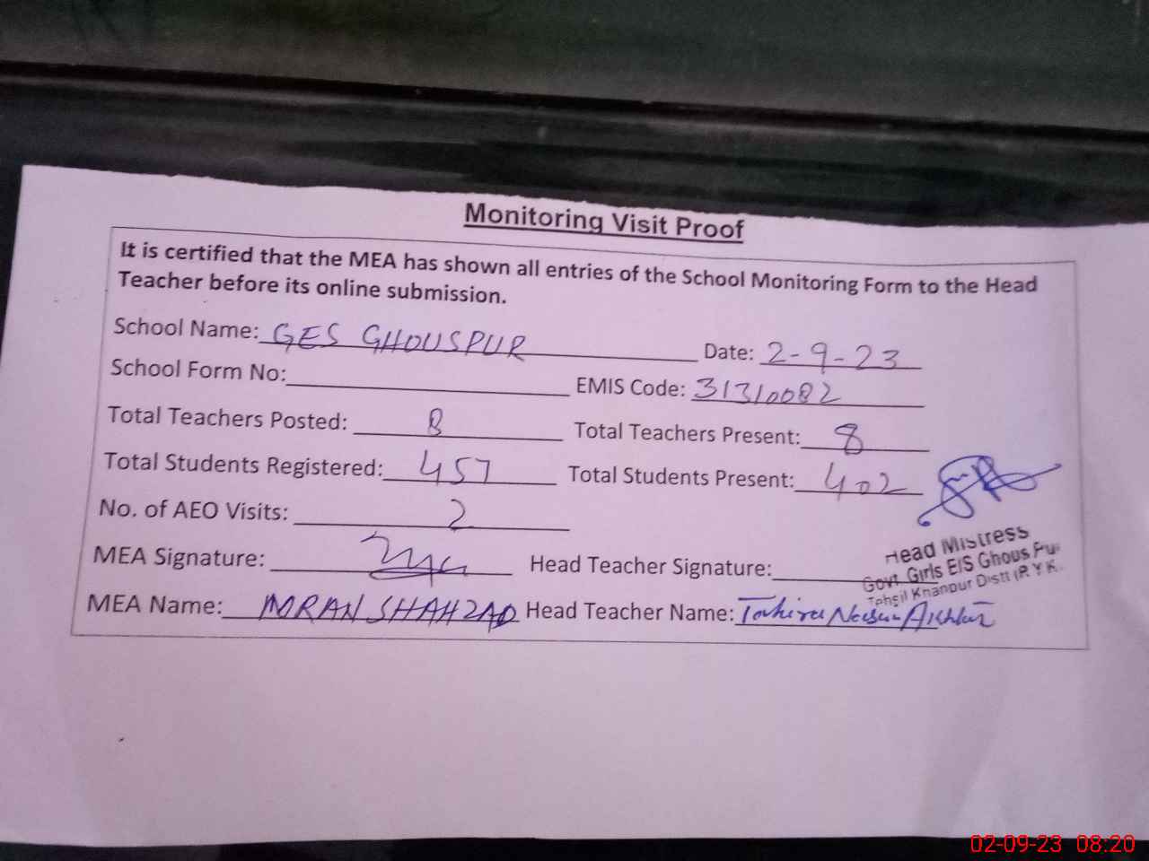 | Attendance Register | Head Teacher | MEA with School | Visit Proof |