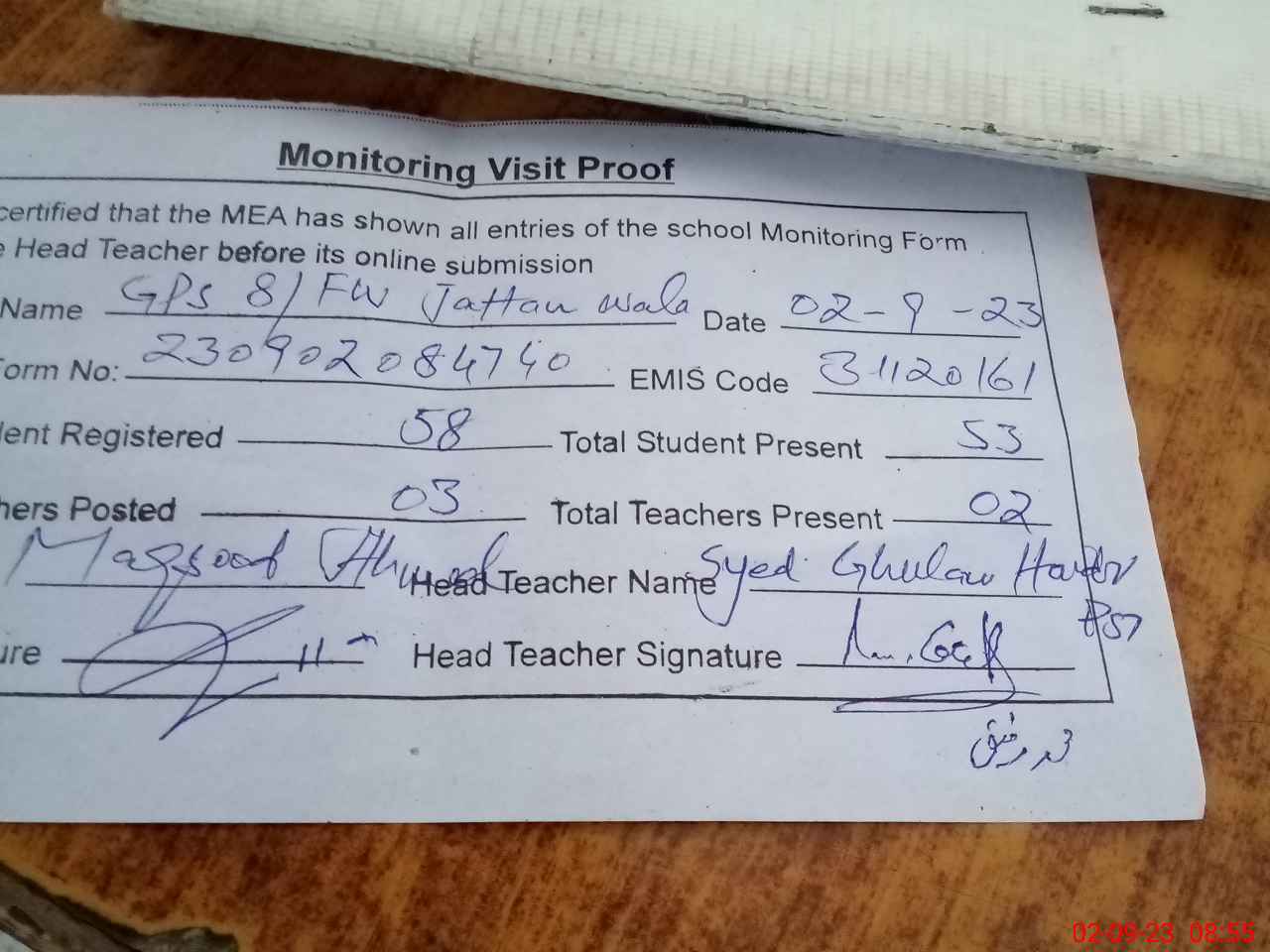| EMIS Code: 31120161 | Name of School: GPS CHAK NO. 8/FW JATTAN WALA | |||