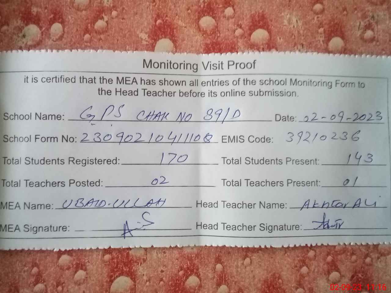 | EMIS Code: 39210236 | Name of School: GPS CHAK NO. 89 /D | |||
