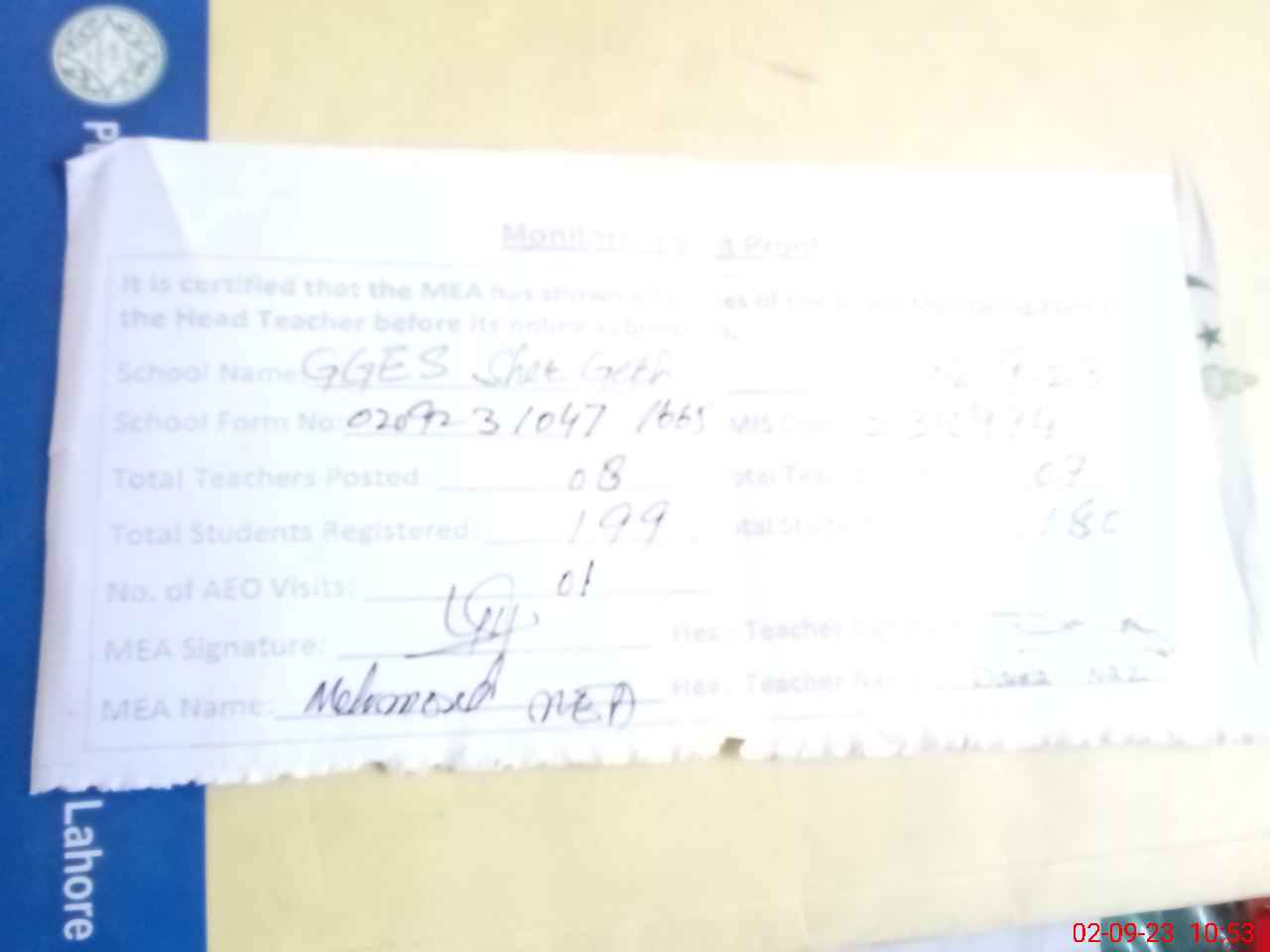 | Monitoring Date: 02-09-2023 | Start Time: 02-09-2023 10:18 AM | End Time: 02-09-2023 10:53 AM | Name of MEA: Ma**** UlHa**** | |