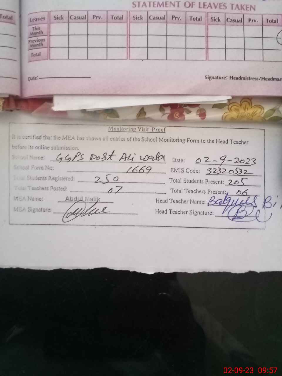 | Attendance Register | Head Teacher | MEA with School | Visit Proof |