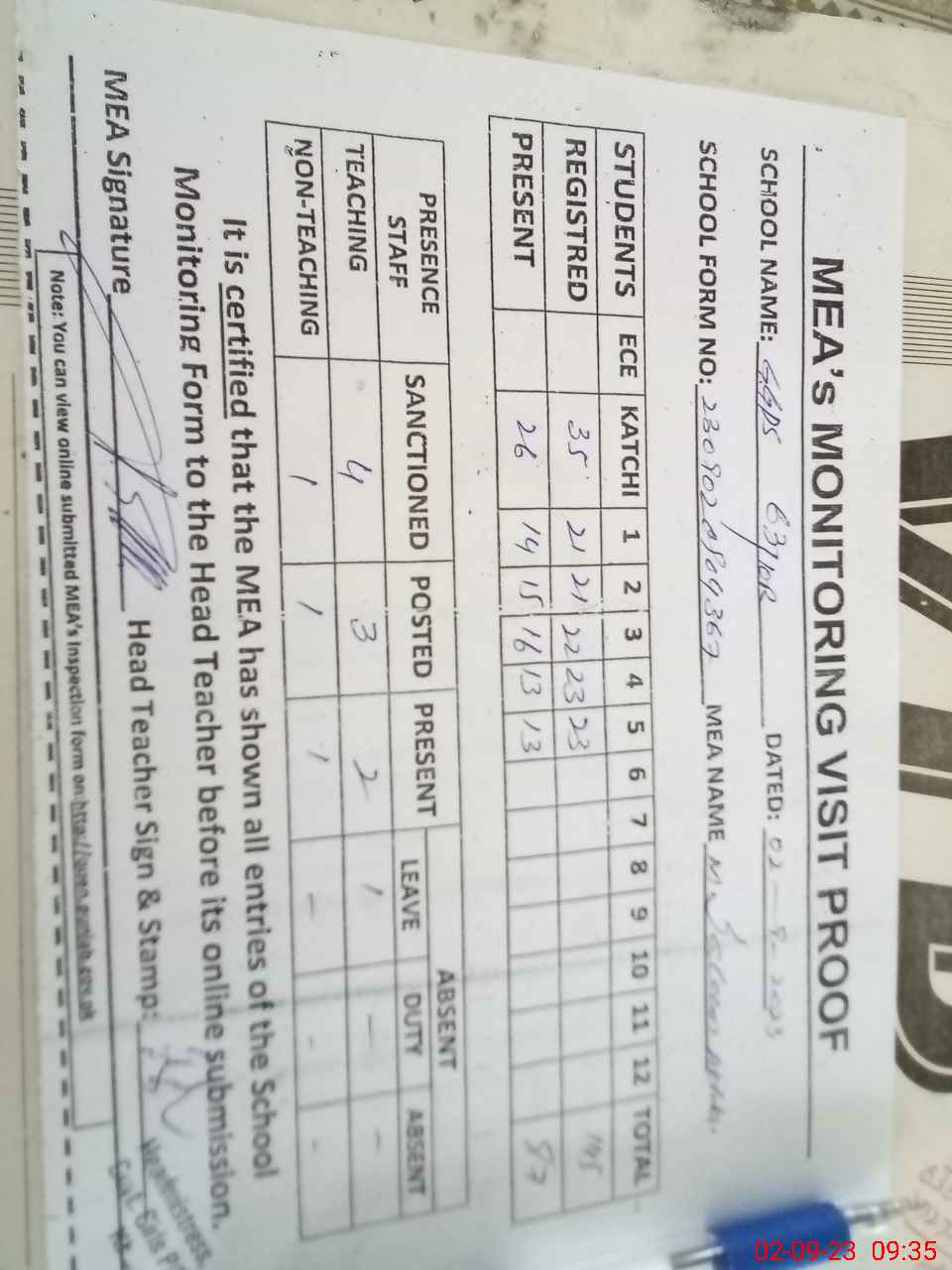 | Attendance Register | Head Teacher | MEA with School | Visit Proof |