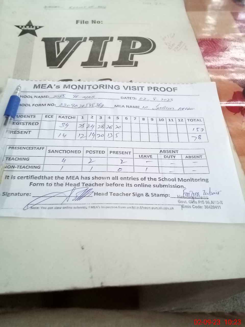 | Remarks (Use Separate Page if Required): After noon school class 6th and 8th attendance on register not mark Aeo not visited the school in August 2023 | |||||