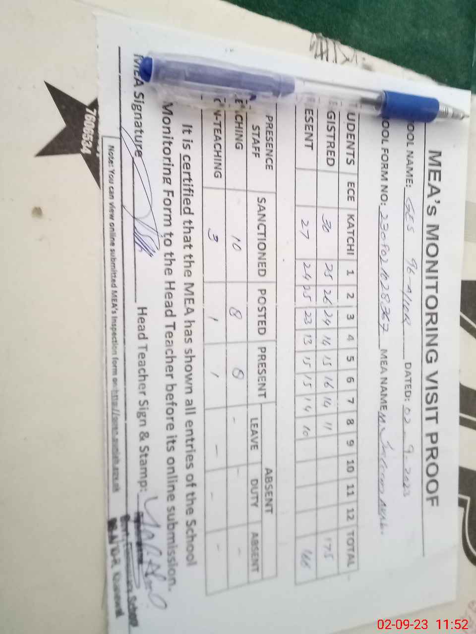 | Attendance Register | Head Teacher | MEA with School | Visit Proof |