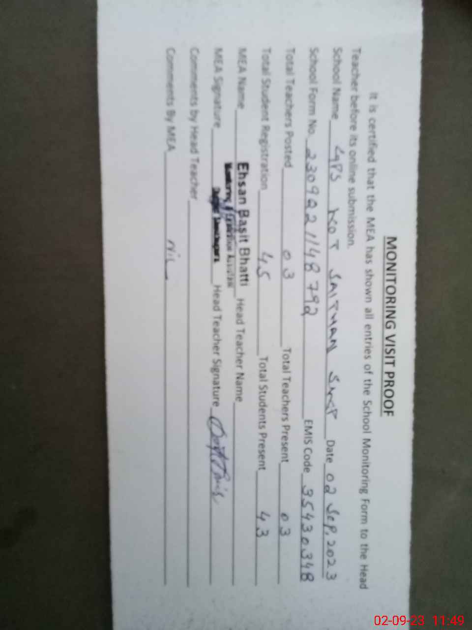 | Attendance Register | Head Teacher | MEA with School | Visit Proof |