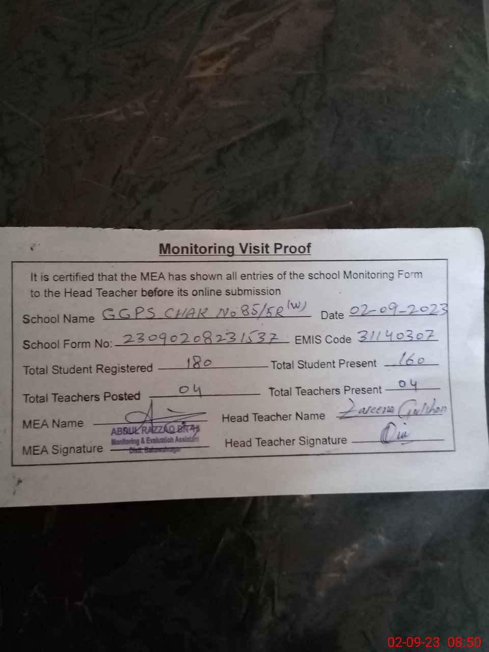 | Attendance Register | Head Teacher | MEA with School | Visit Proof |