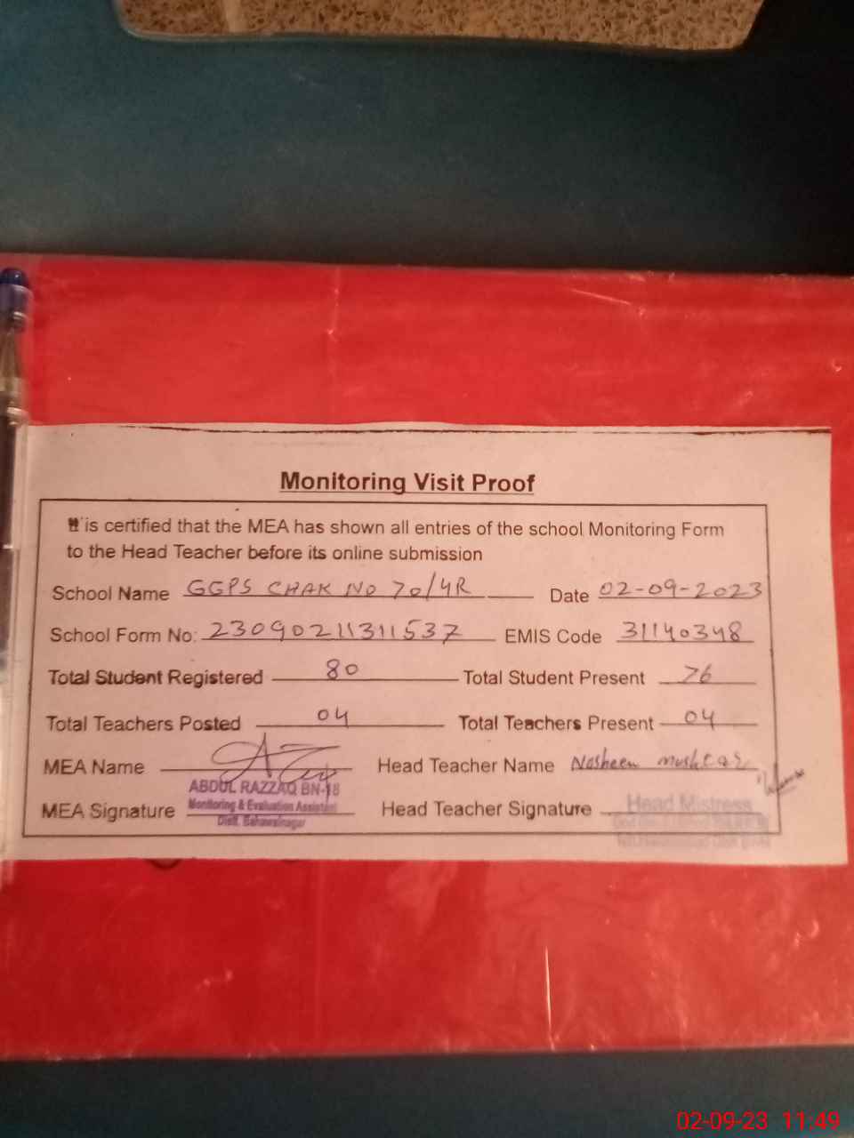 | EMIS Code: 31140348 | Name of School: GGPS CHAK NO 70/4-R | |||
