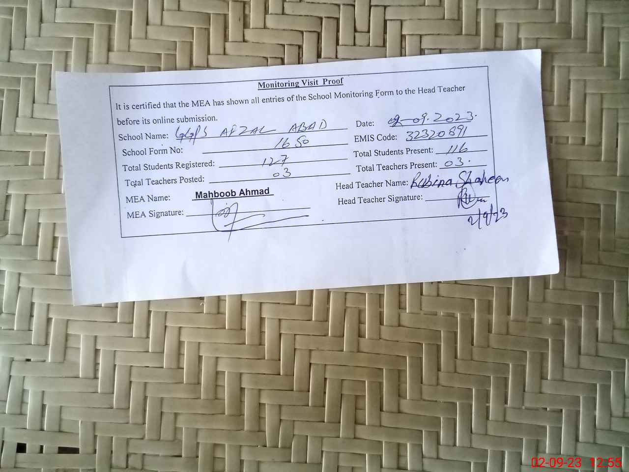 | Attendance Register | Head Teacher | MEA with School | Visit Proof |