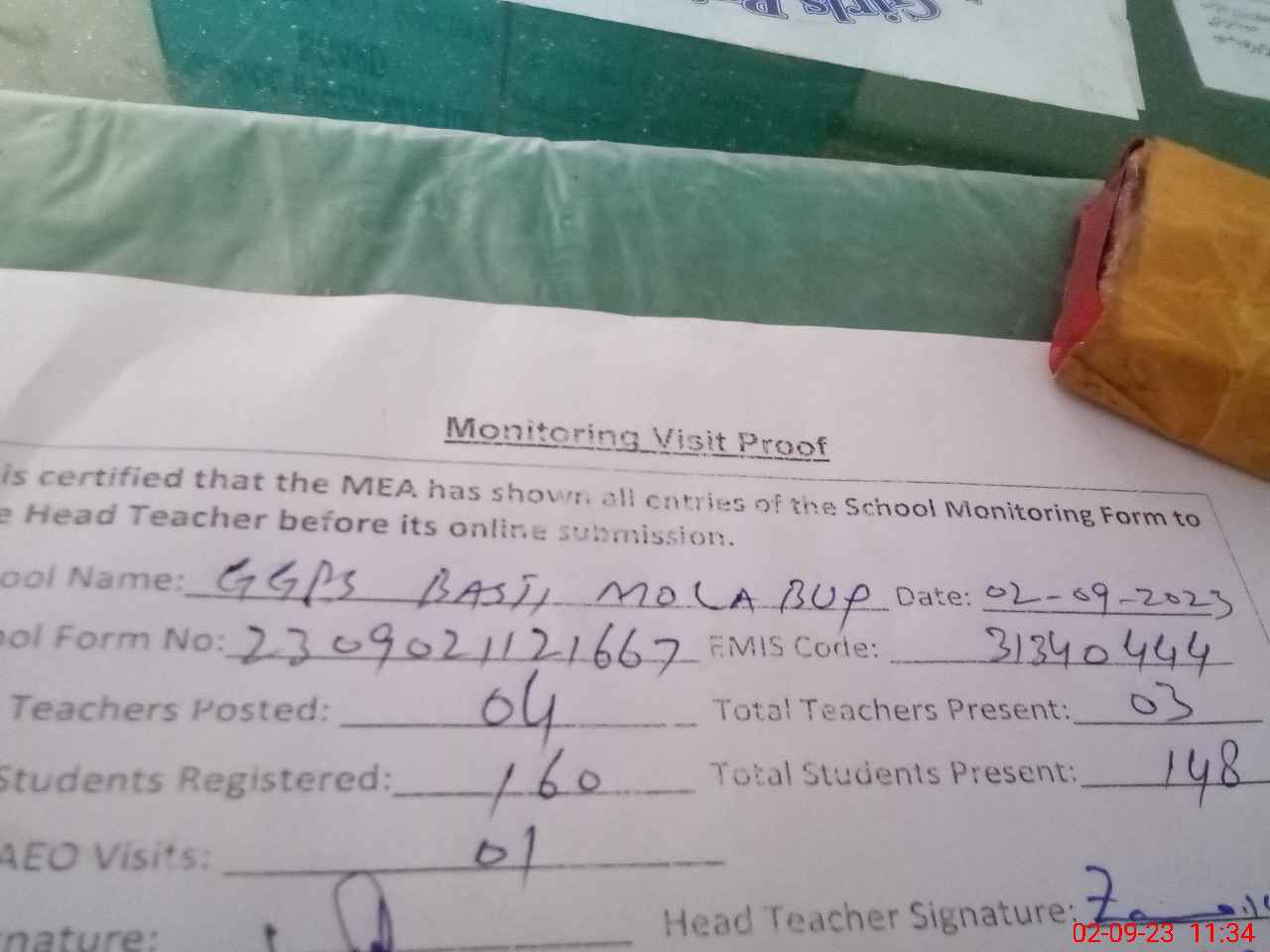 | Attendance Register | Head Teacher | MEA with School | Visit Proof |