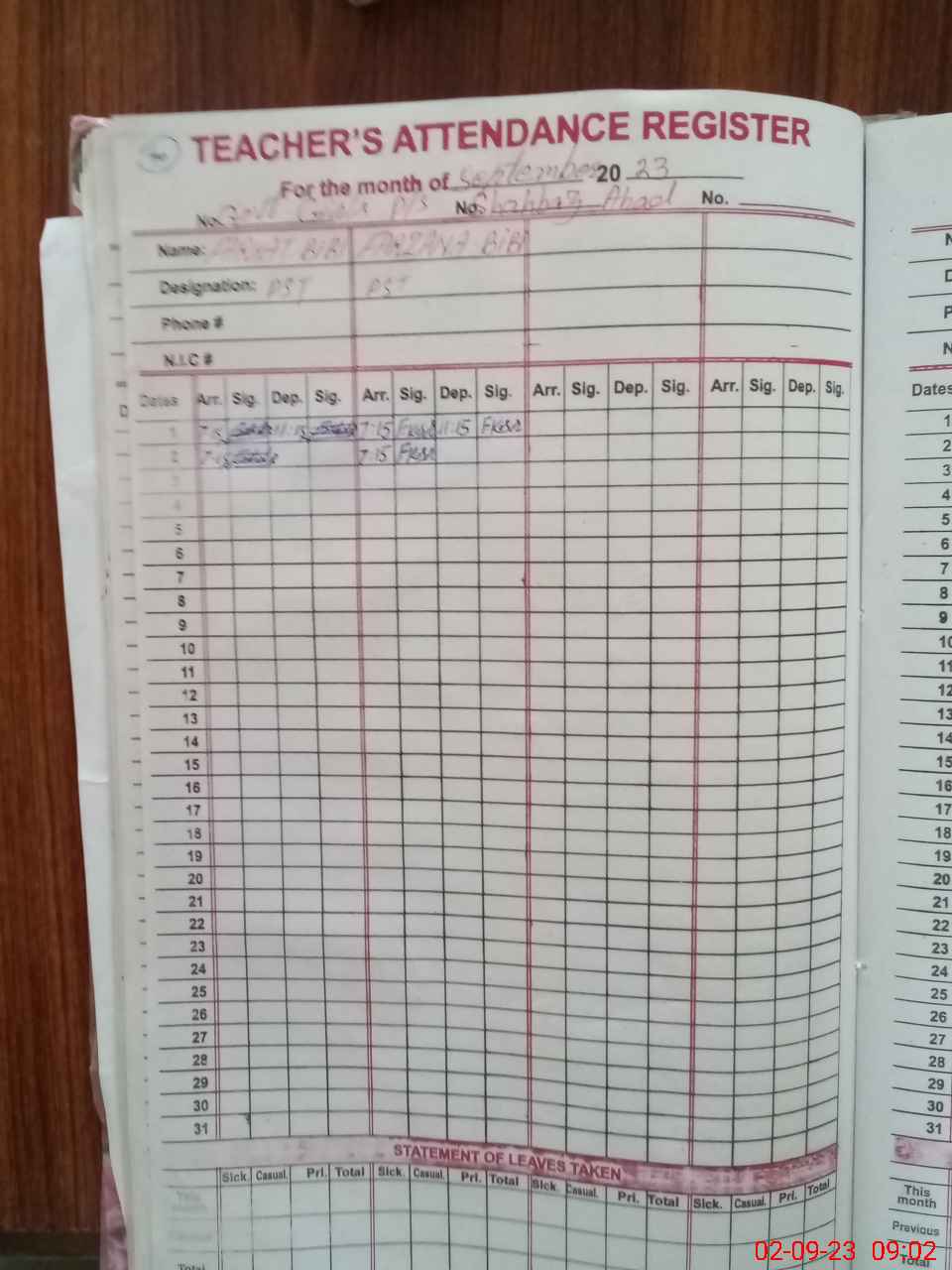 | CNIC | Full Name | Designation | R/C | Absence During Last Calender Month |