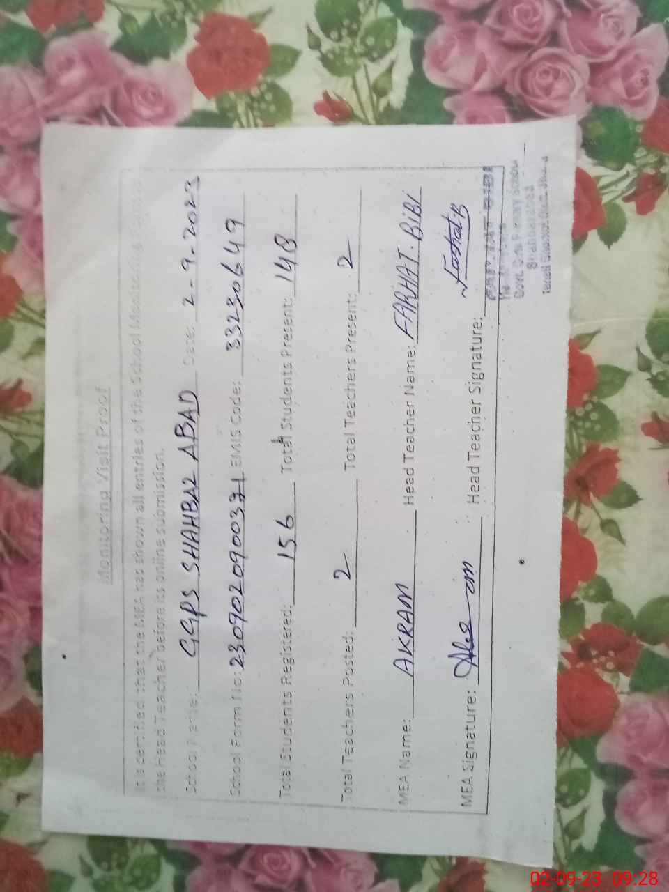 | Attendance Register | Head Teacher | MEA with School | Visit Proof |