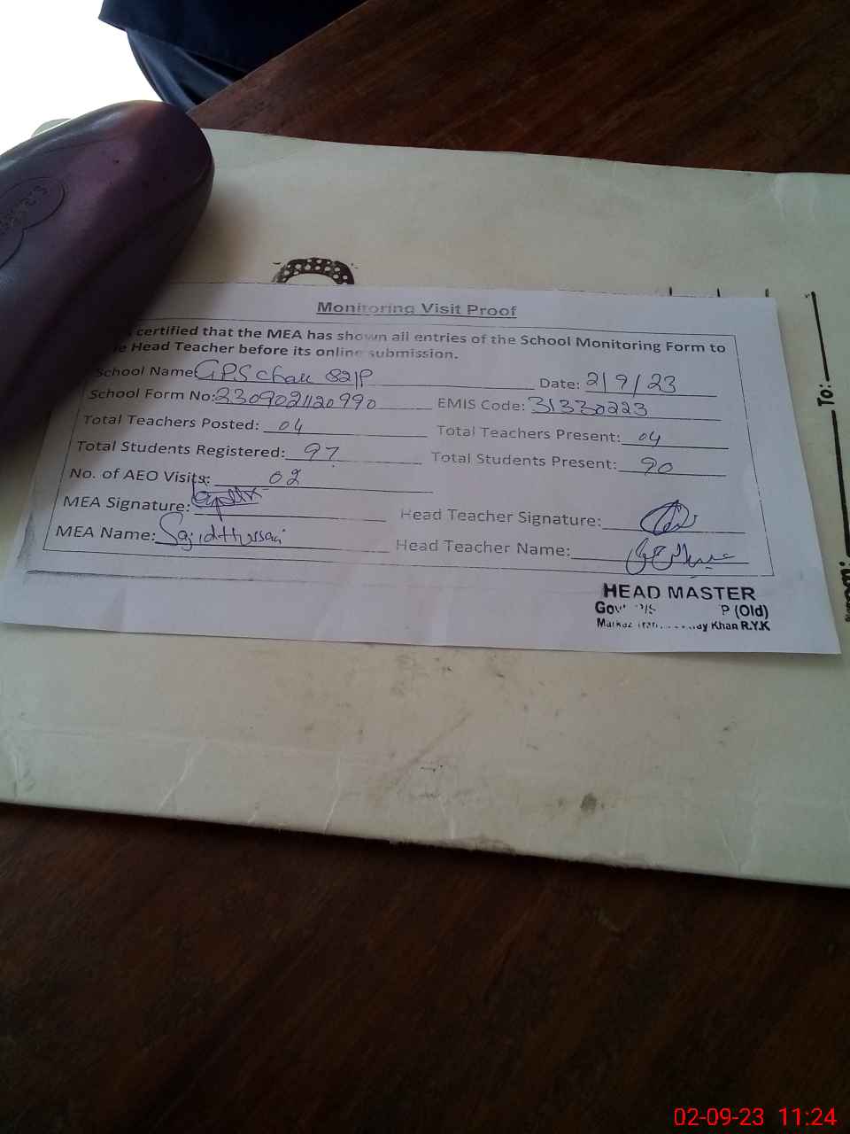 | Attendance Register | Head Teacher | MEA with School | Visit Proof |