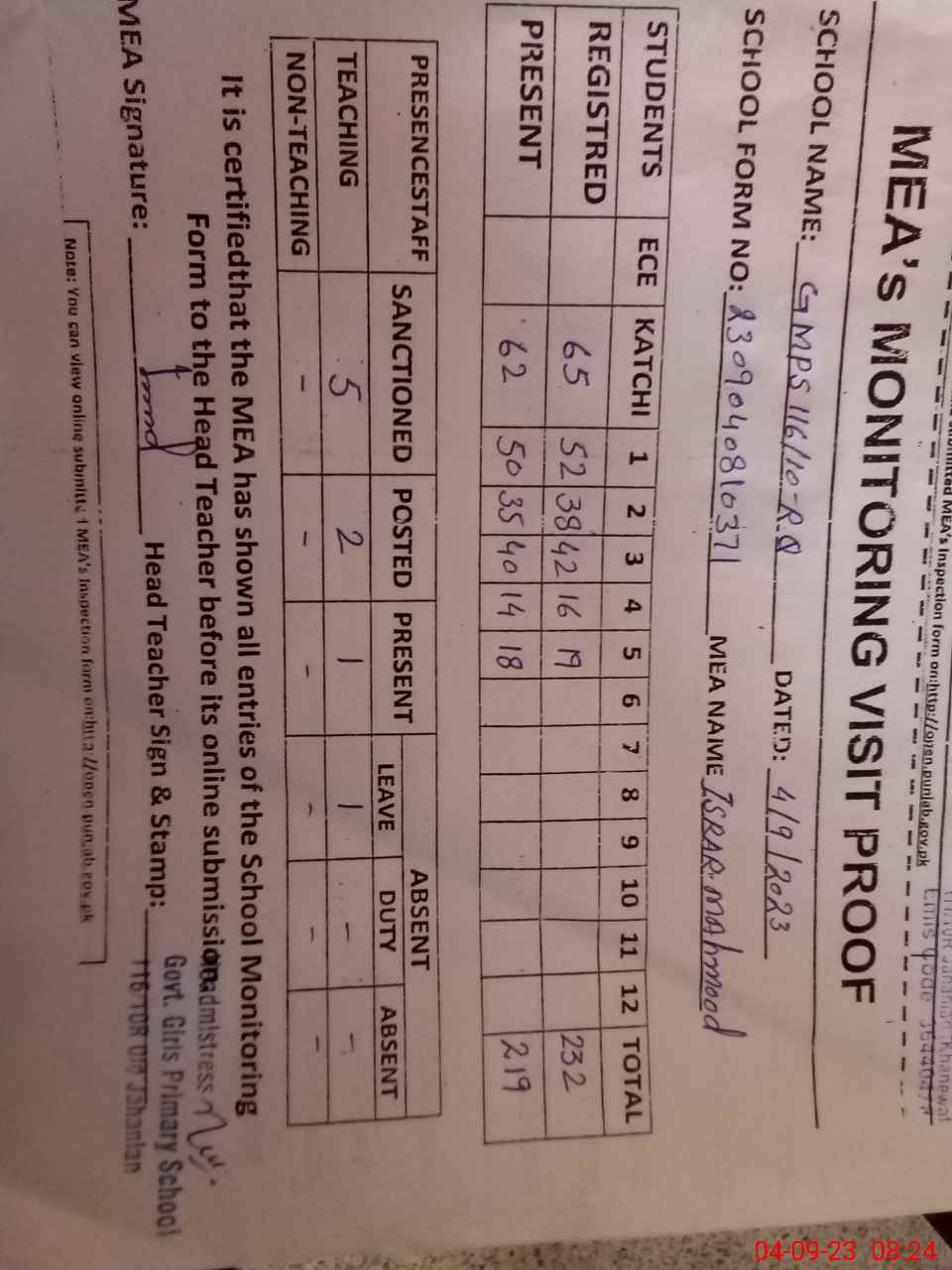 | Attendance Register | Head Teacher | MEA with School | Visit Proof |