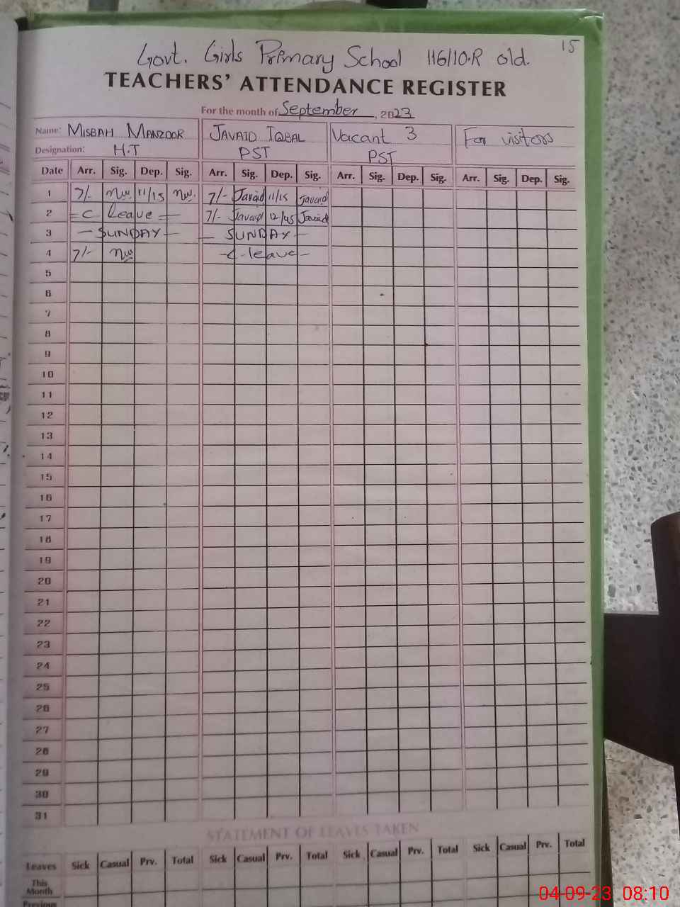 | Leave | Duty | Absent | Maternity | Medical | Ex- Pak |