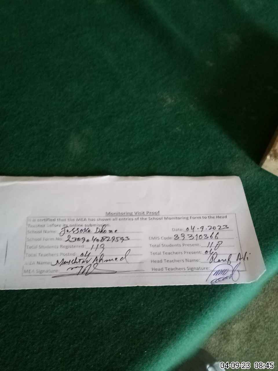 | Attendance Register | Head Teacher | MEA with School | Visit Proof |