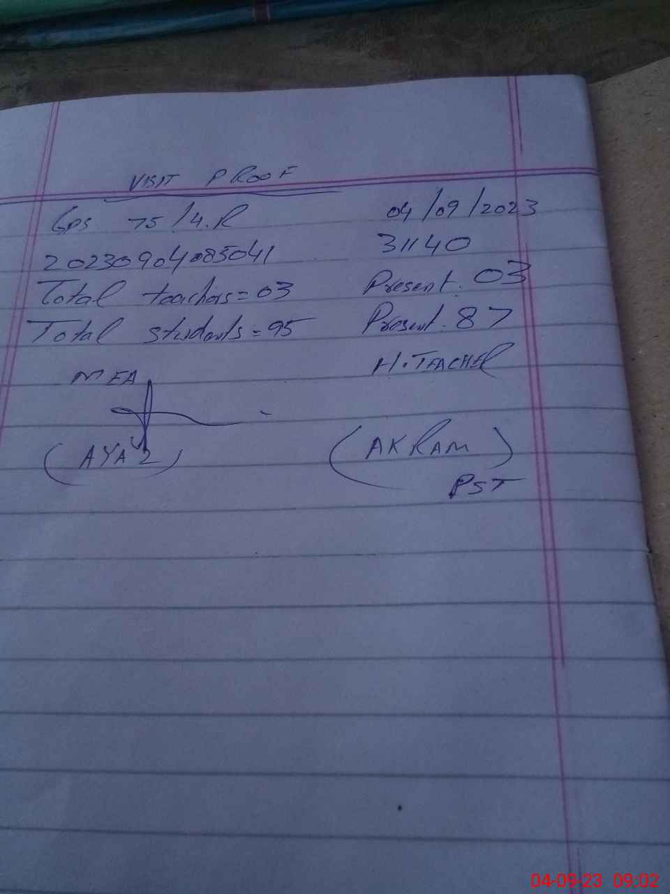 | Attendance Register | Head Teacher | MEA with School | Visit Proof |