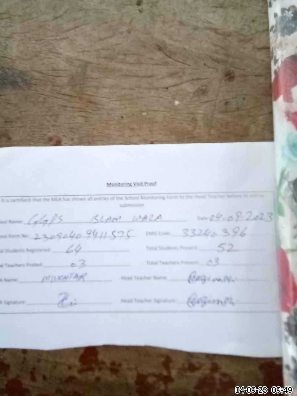 | Attendance Register | Head Teacher | MEA with School | Visit Proof |