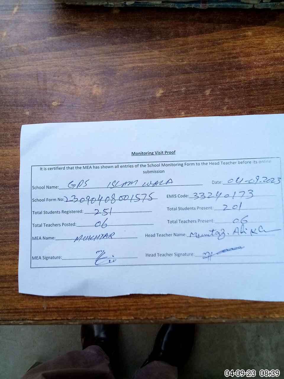 | EMIS Code: 33240173 | Name of School: GPS ISLAM WALA | |||