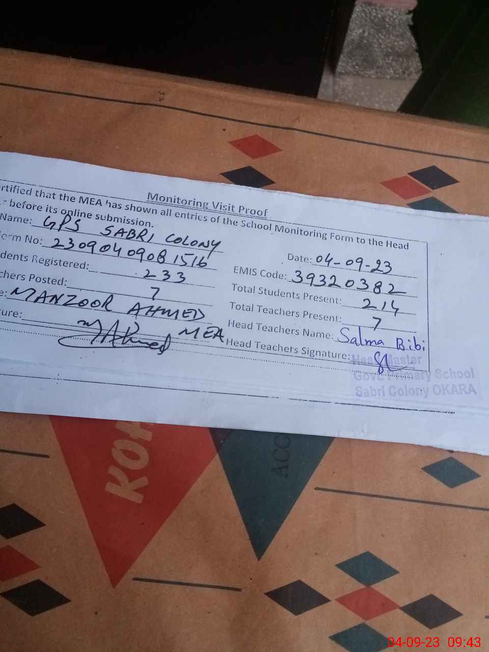 | Attendance Register | Head Teacher | MEA with School | Visit Proof |