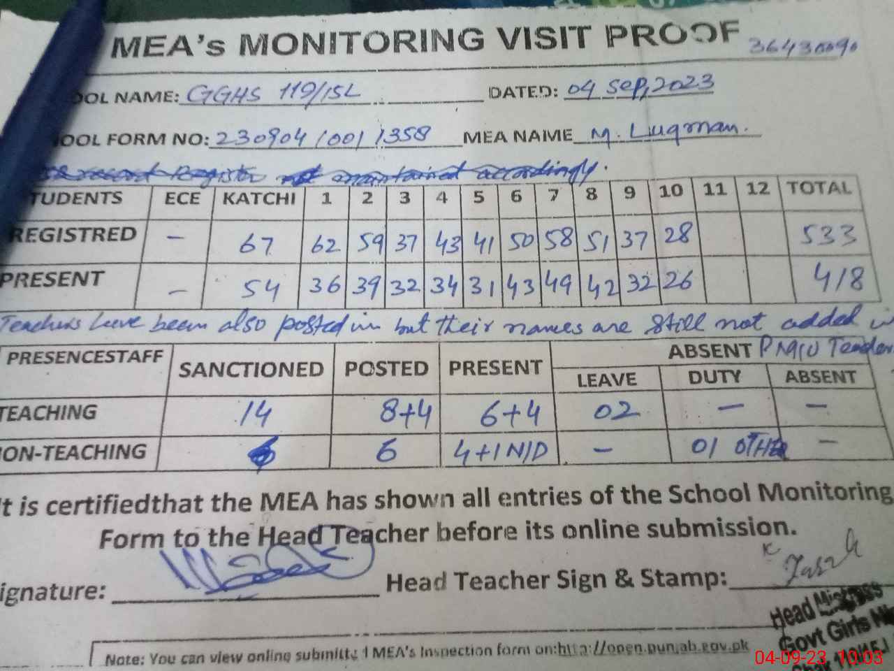 | Attendance Register | Head Teacher | MEA with School | Visit Proof |