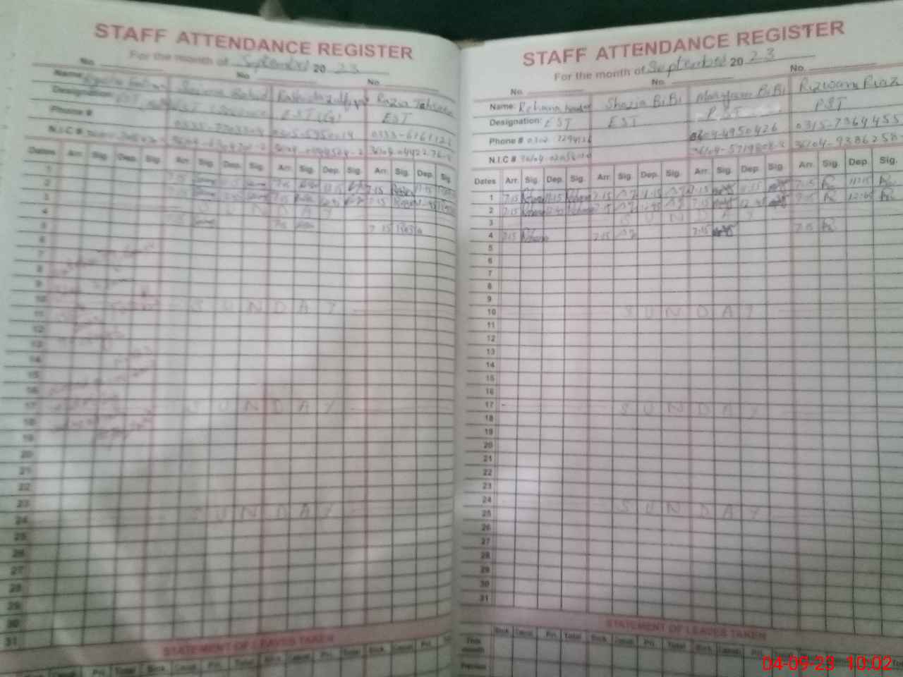 | CNIC | Full Name | Designation | R/C | Absence During Last Calender Month |