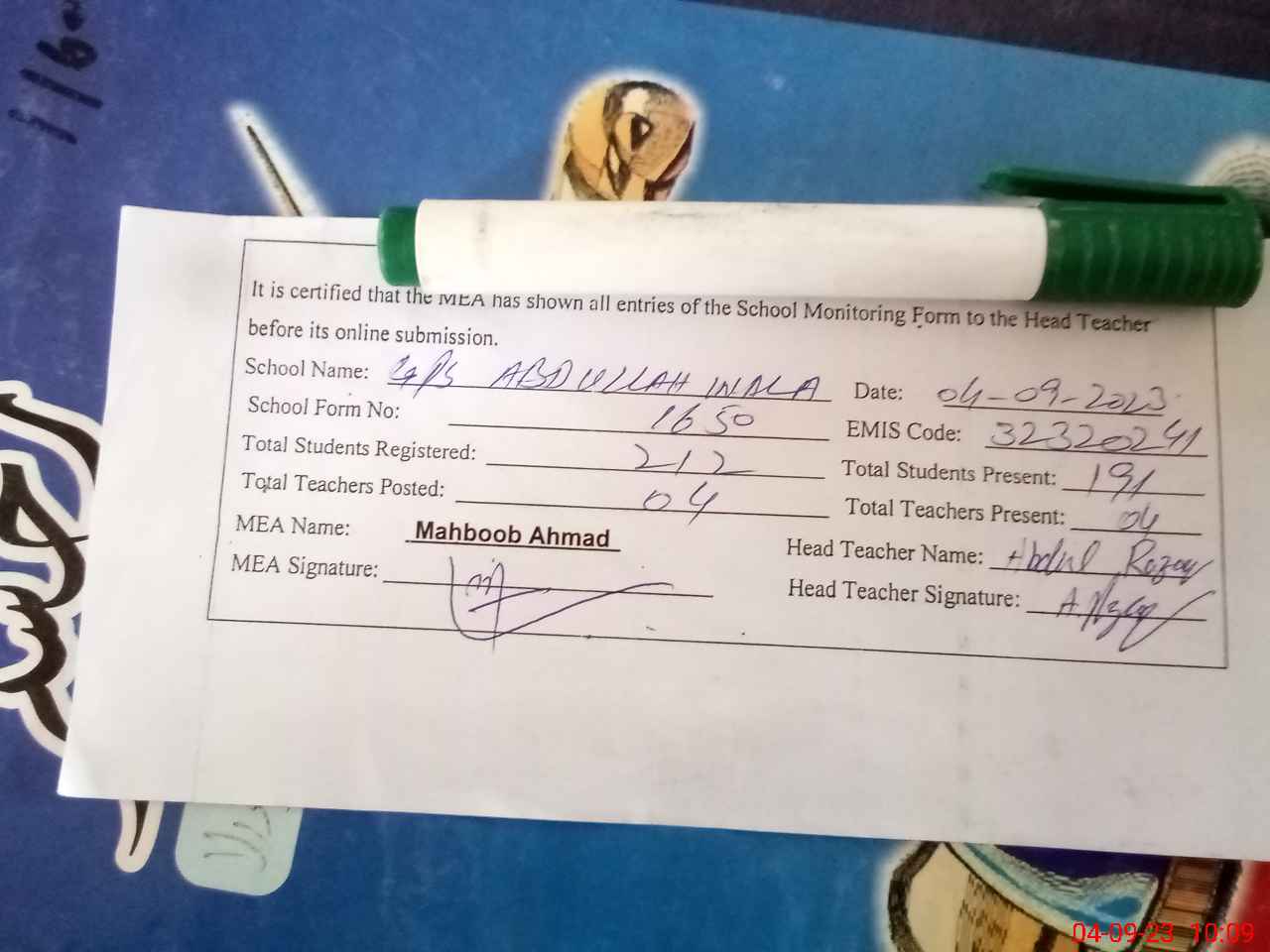 | EMIS Code: 32320241 | Name of School: GPS ABDULLAH WALA | |||